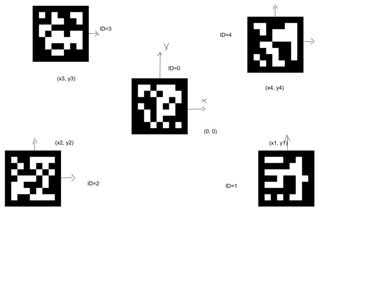 • Xác định chuẩn xác vị trí tương đối của các ID1, ID2, ID3, ID4 so với ID0 ở trung tâm (lấy hệ tọa độ mặt phẳng là trục x, y của marker ID0). Nên đặt các marker vùng rìa không đối xứng nhau nhằm tối ưu tính toán tọa độ trong trường hợp bị che khuất. Gắn các marker sao cho các trục x, y, z cùng hướng với nhau.